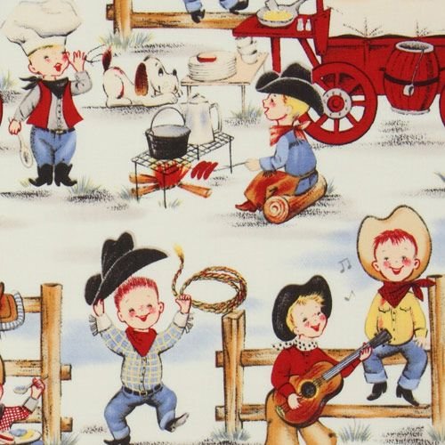 Michael Miller drôles garçons millésime cowboy tissu (vendus par multiples de 0,5 mètres)?tissu designer avec de nombreux garçons habillés comme des cow-boys dans un ranch des Etats-Unis